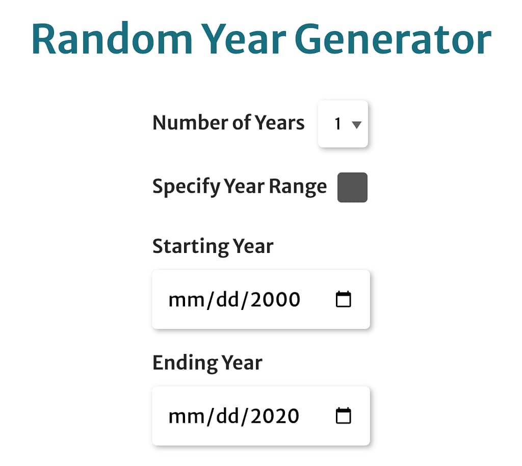 Simply click the “Generate” button, and the tool will generate a random year. You can also specify how many years you want to generate and define a timeframe for the years to fall between. For example, you could generate ten random years between 1900 and 1950.